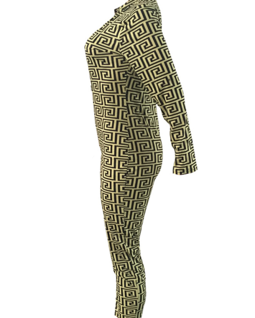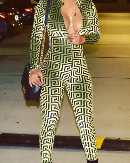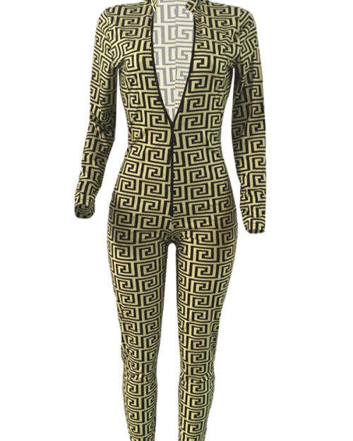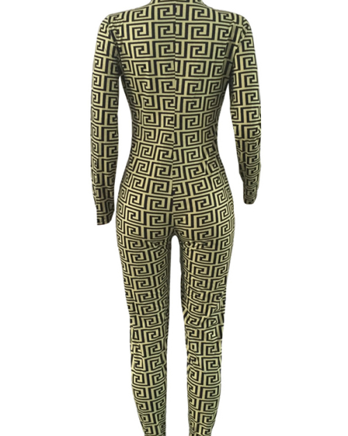 Euramerican Deep V Neck Geometric Printed Green Polyester One-piece Jumpsuits