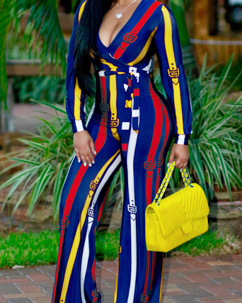 Euramerican Deep V Neck Striped Yellow Polyester One-piece Jumpsuits