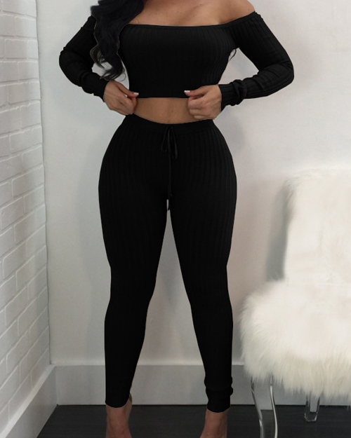 Euramerican Dew Shoulder Black Cotton Two-piece Pants Set