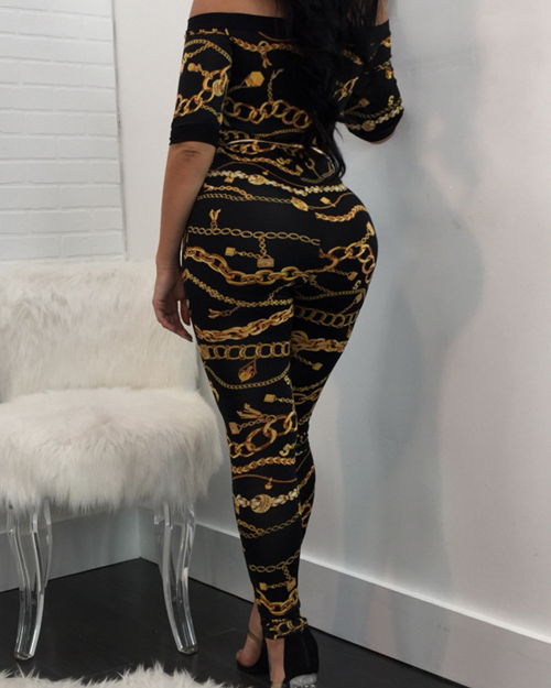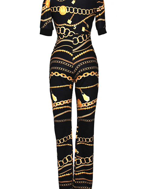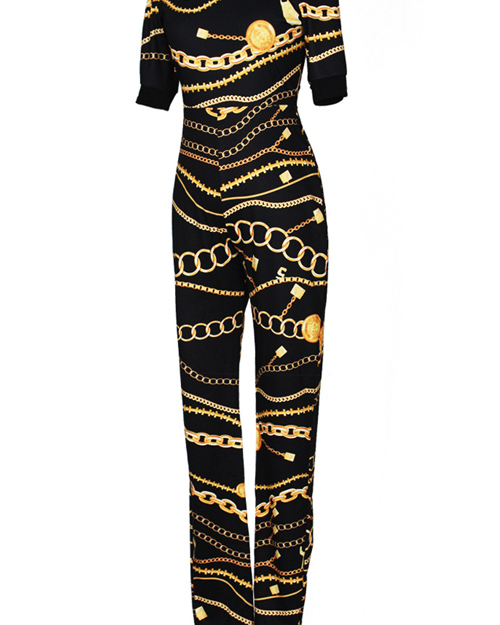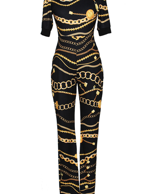 Euramerican Dew Shoulder Chain Printed Black Polyester One-piece Jumpsuits(Without Belt)