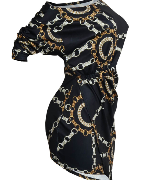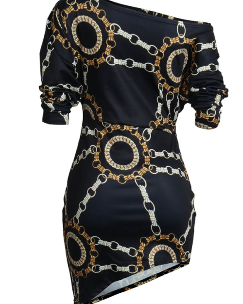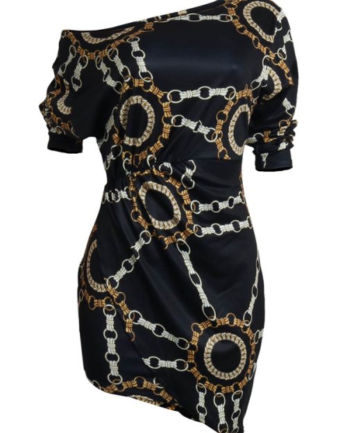 Euramerican Dew Shoulder Chain Printing Black Polyester Sheath Mini Dress