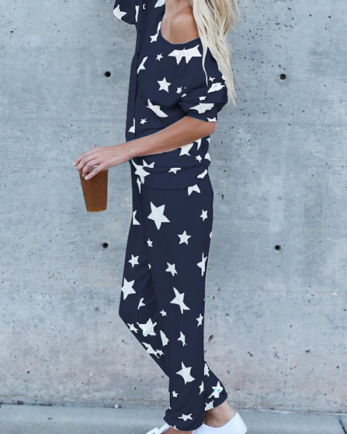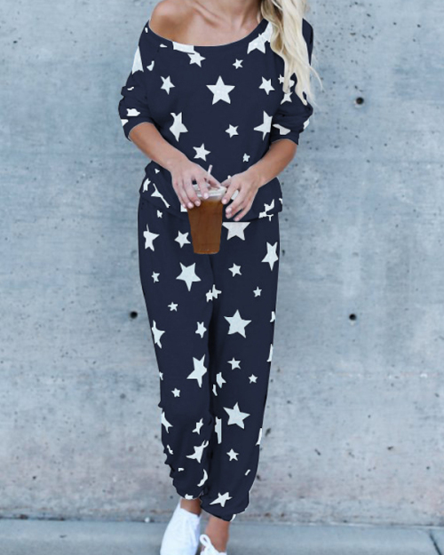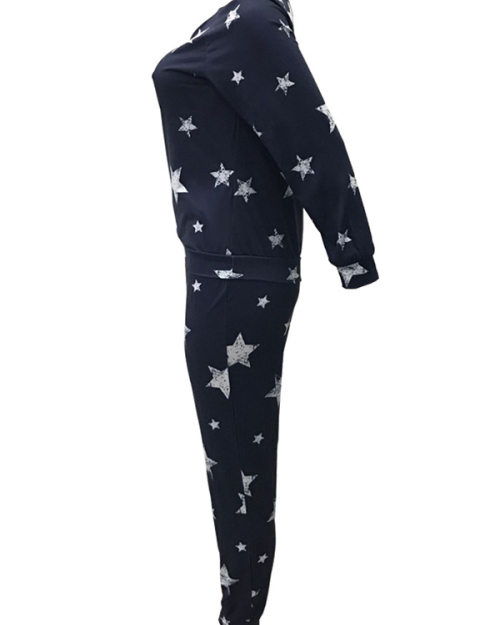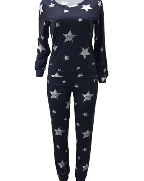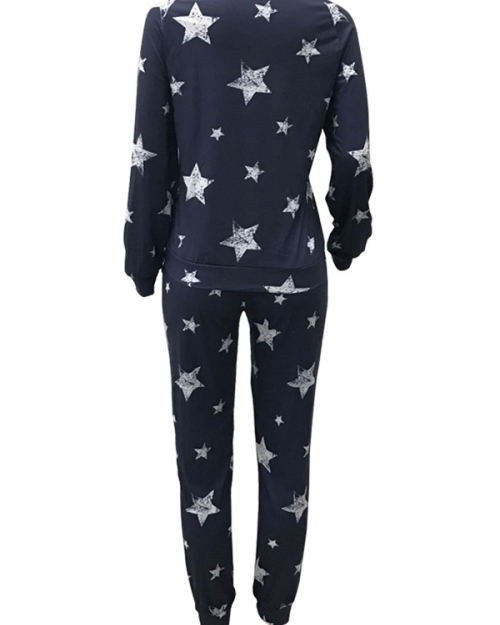 Euramerican Dew Shoulder Five-stars Printed Navy Blue Cotton Two-piece Pants Set