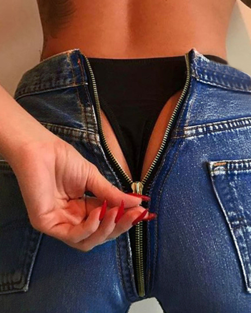 Euramerican High Waist Zipper Design Deep Blue Denim Jeans