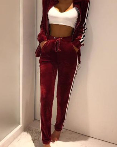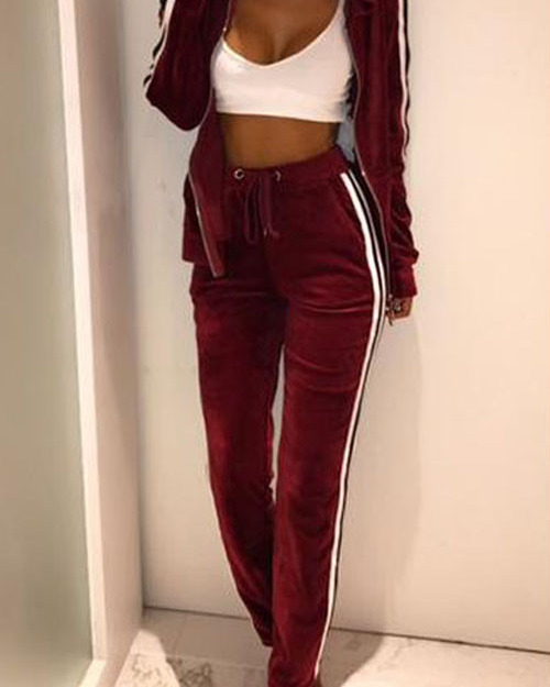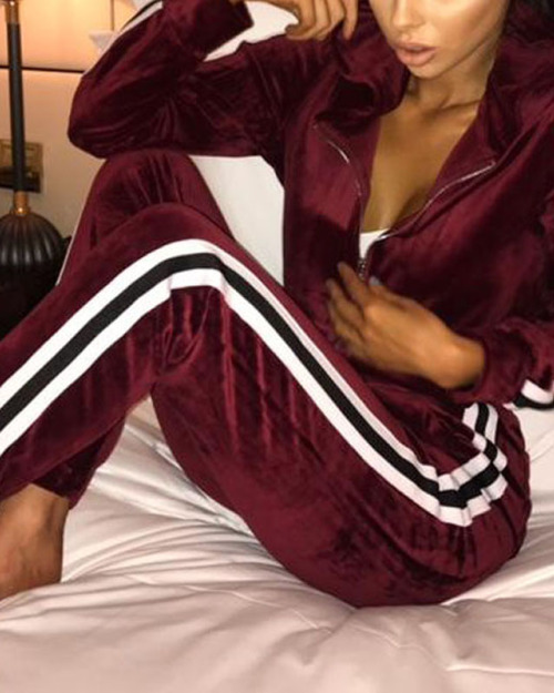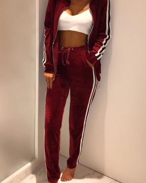 Euramerican Long Sleeves Patchwork Wine Red Velvet Two-piece Pants Set