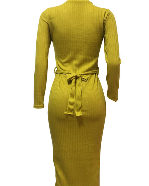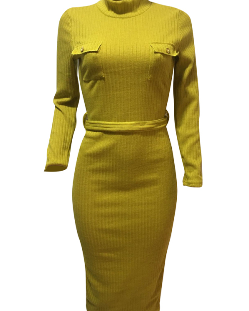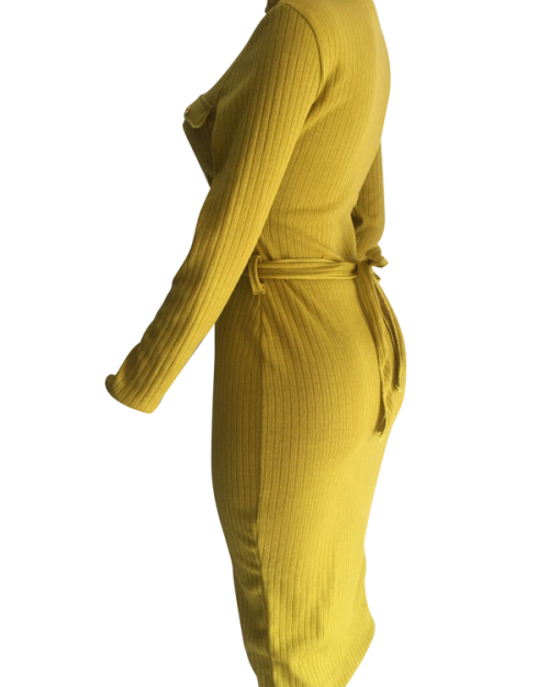 Euramerican Long Sleeves Yellow Polyester Sheath Mid Calf Dress