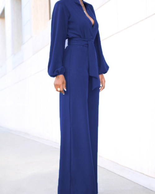 Euramerican Mandarin Collar Blue Spandex One-piece Jumpsuits