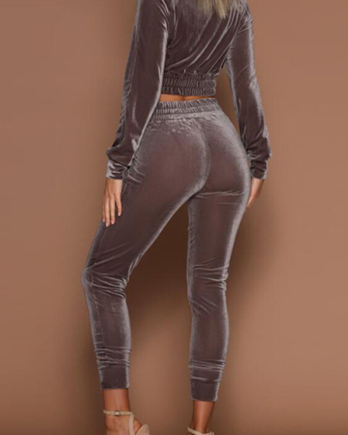 Euramerican Mandarin Collar Zipper Design Grey Cotton Two-piece Pants Set
