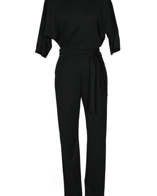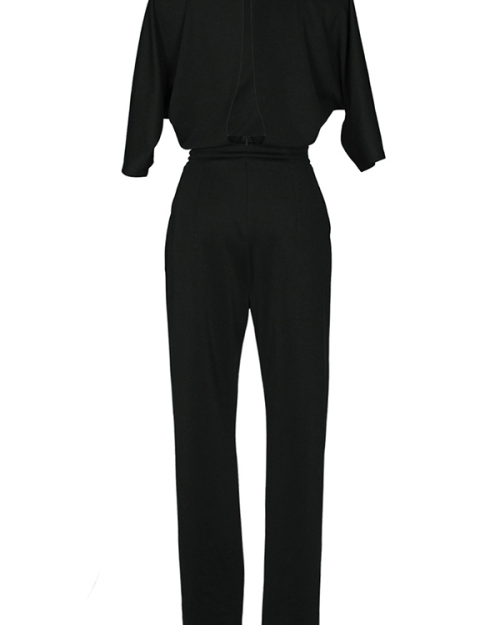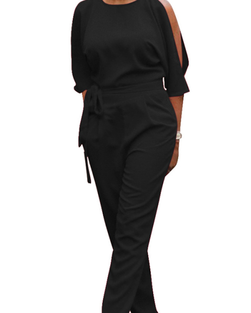 Euramerican Round Neck Dew Shoulder Black Polyester One-piece Jumpsuits
