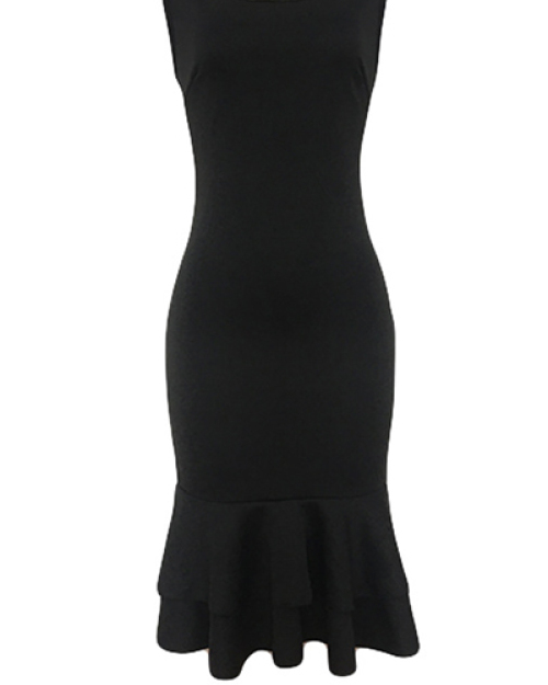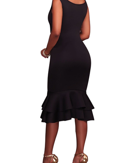 Euramerican Round Neck Falbala Design Black Polyester Sheath Mid Calf Dress