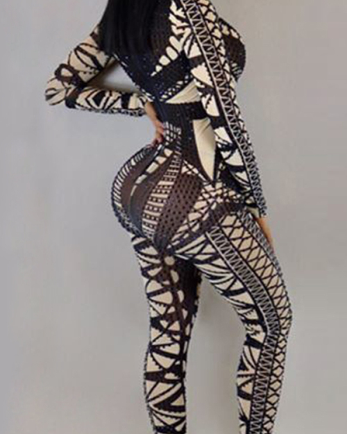 Euramerican Round Neck Geometric Printed Black Polyester One-piece Jumpsuits
