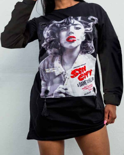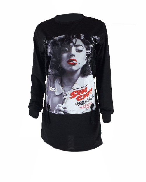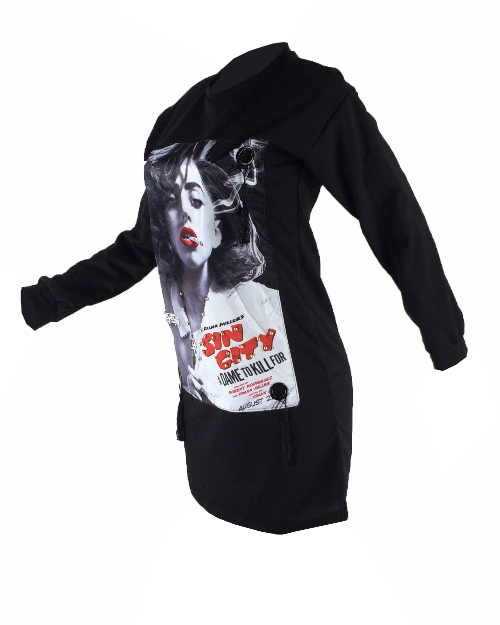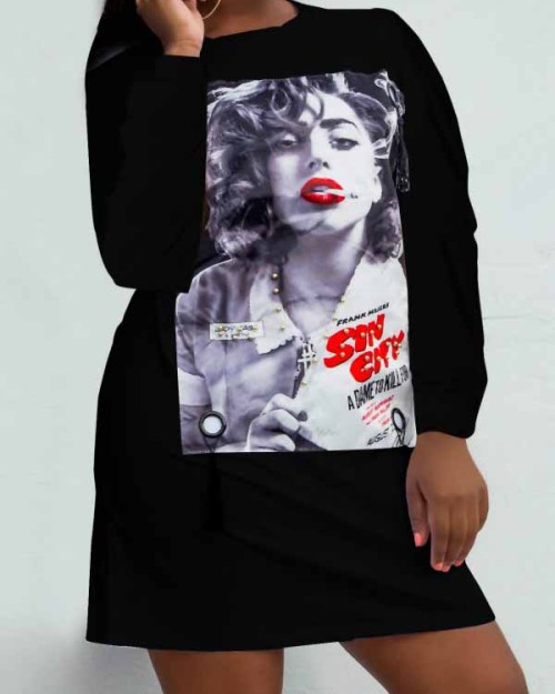 Euramerican Round Neck Portrait Printed Black Polyester Mini Dress