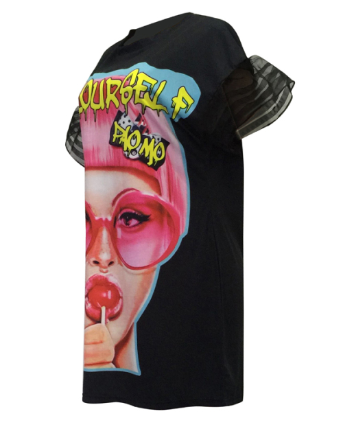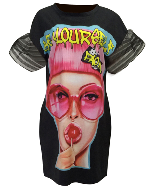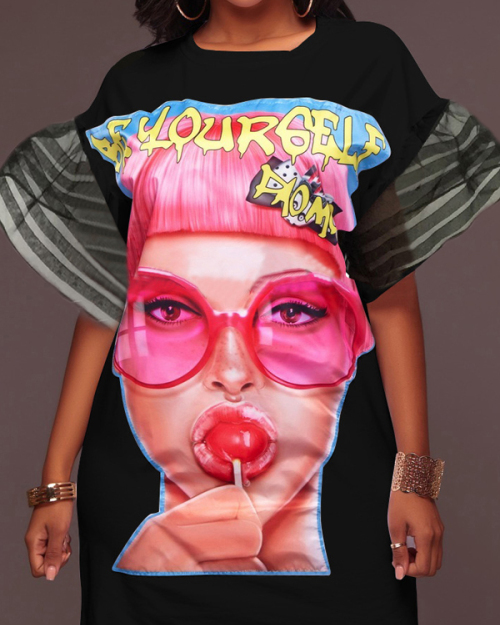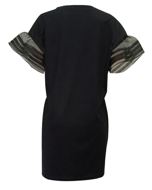 Euramerican Round Neck Printed Black Polyester Mini Dress