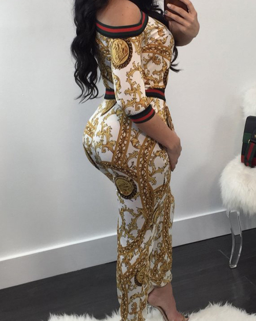Euramerican Round Neck Printed Patchwork White Polyester Two-piece Pants Set