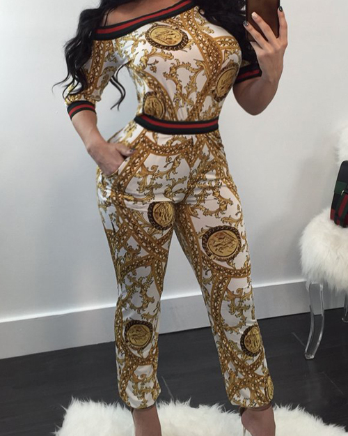Euramerican Round Neck Printed Patchwork White Polyester Two-piece Pants Set  Euramerican Round Neck Printed Patchwork White Polyester Two-piece Pants Set