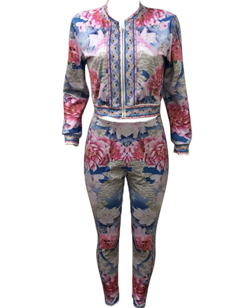 Euramerican Round Neck Printed Polyester Two-piece Pants Set