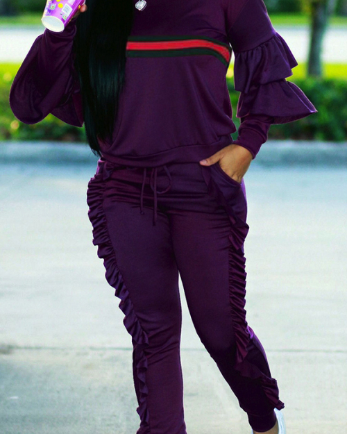 Euramerican Round Neck Ruffle Design Purple Blending Two-Piece Pants Set