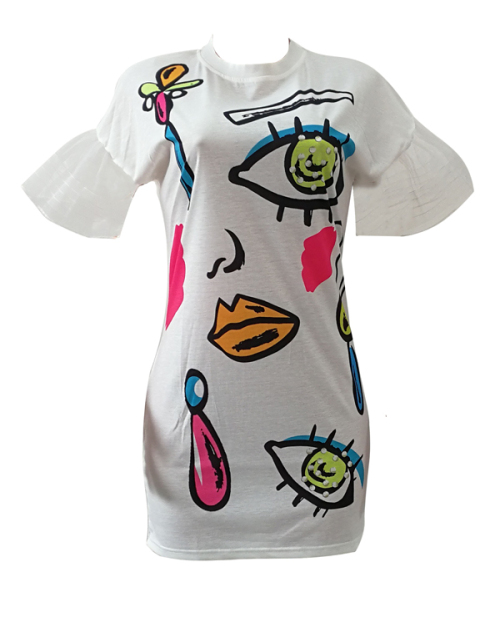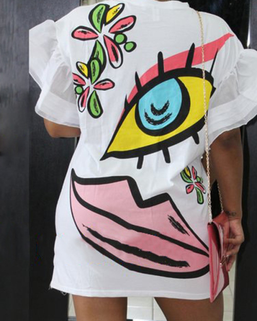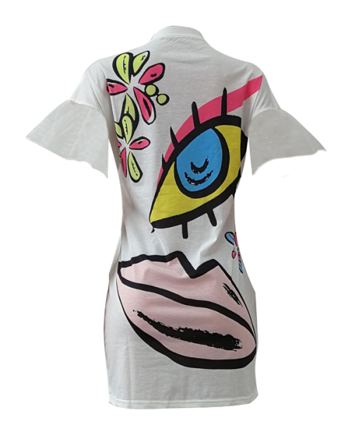 Euramerican Round Neck Short Sleeves Printed White Polyester Sheath Mini Dress