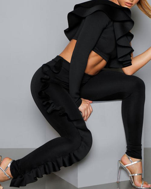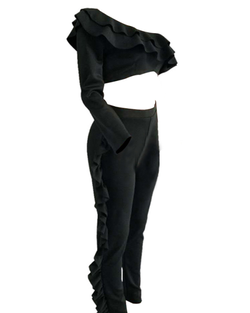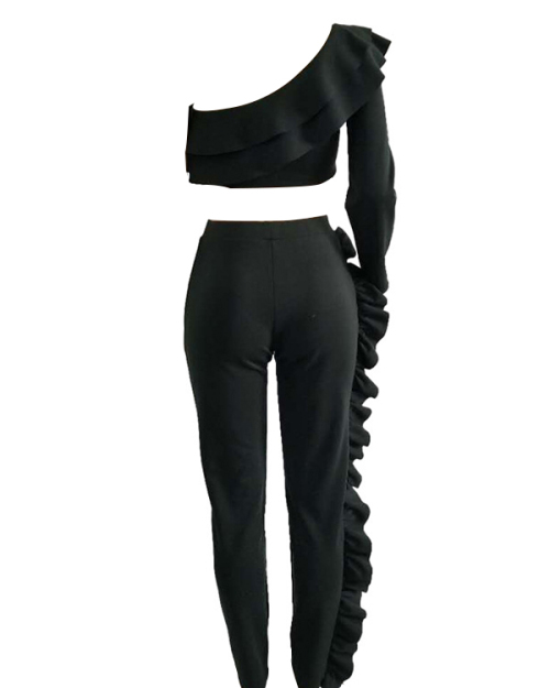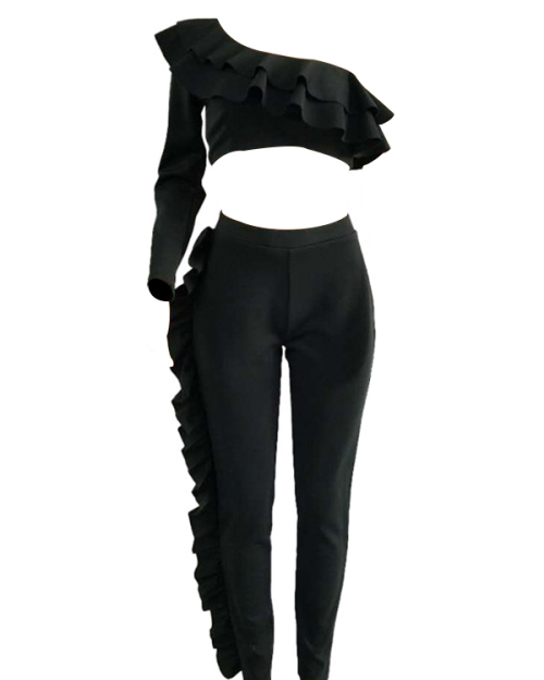 Euramerican Show A Shoulder Asymmetrical Ruffle Design Black Blending Two-piece Pants Set