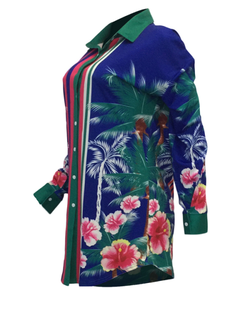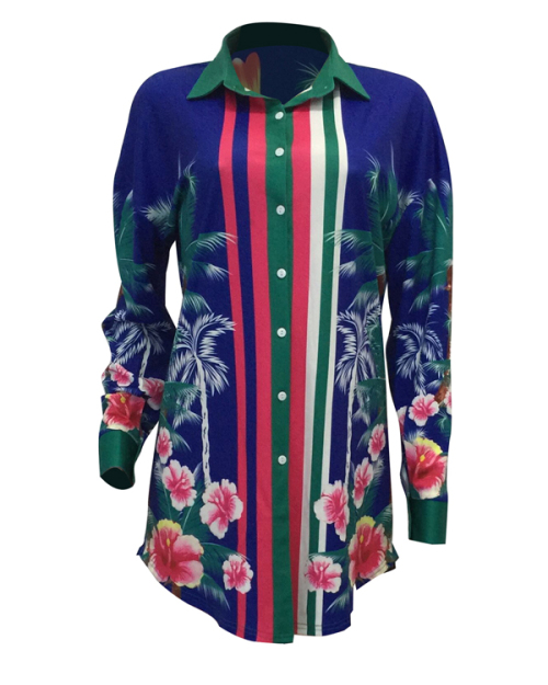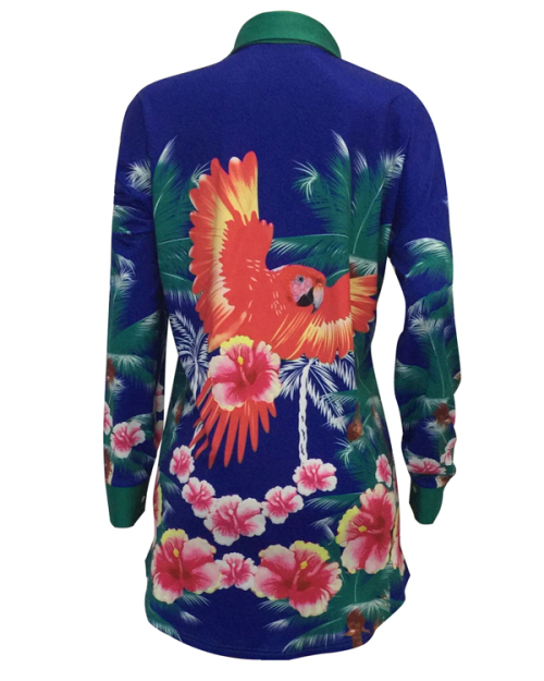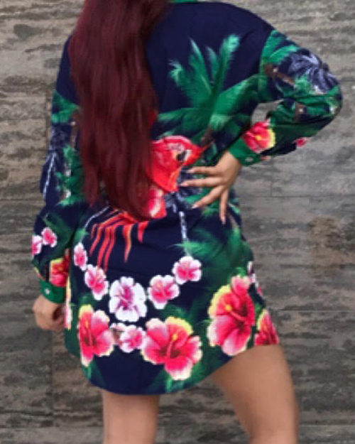 Euramerican Turndown Collar Floral Print Blue Polyester Mini Dress(Without Belt)