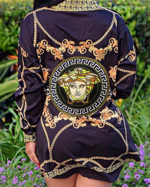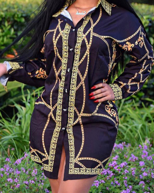 Euramerican Turndown Collar Printed Black Polyester Sheath Mini Dress