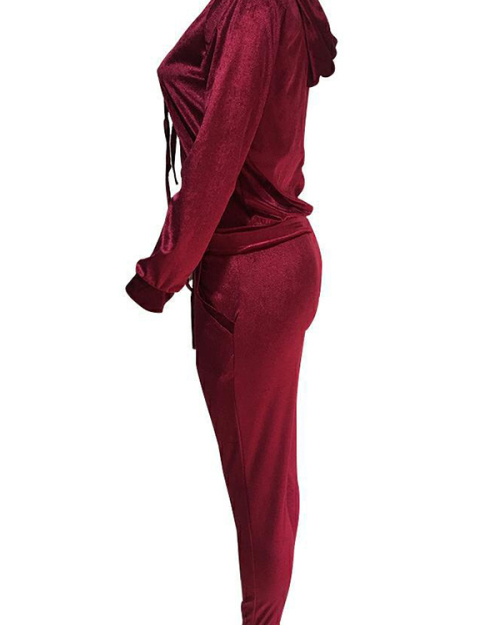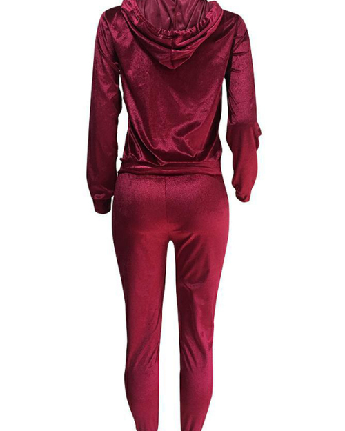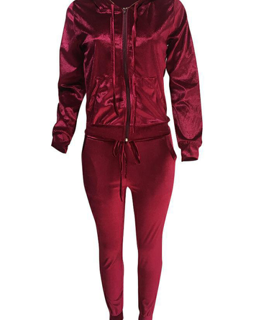 Euramerican Turndown Collar Zipper Design Wine Red Velvet Two-piece Pants Set