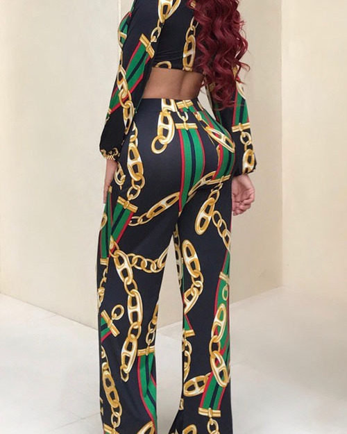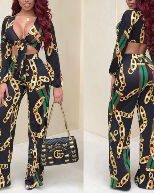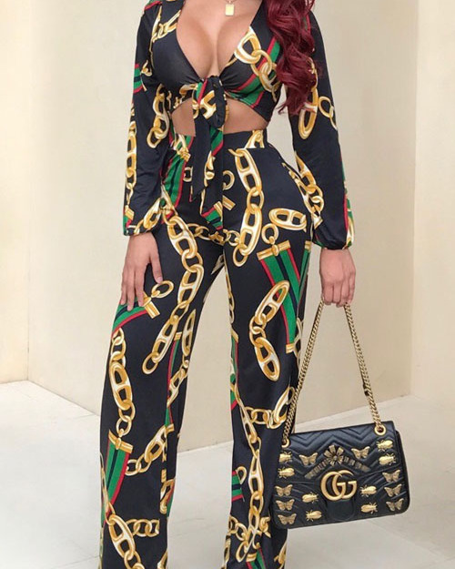 Euramerican V Neck Chain Printing Black Polyester Two-piece Pants Set
