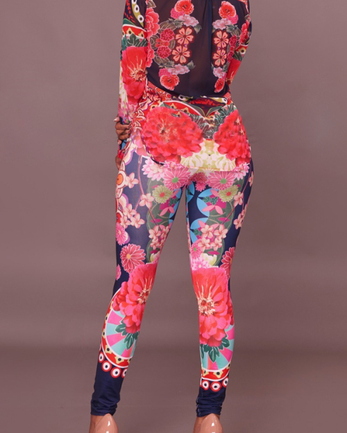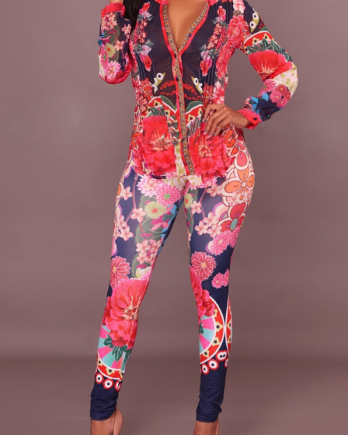 Euramerican V Neck Floral Print Red Polyester Two-piece Pants Set