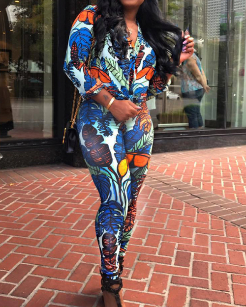 Euramerican V Neck Long Sleeves Printed Blue Milk Fiber Two-piece Pants Set