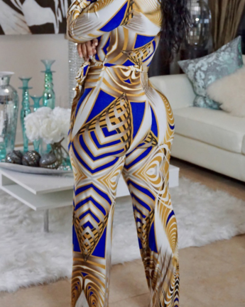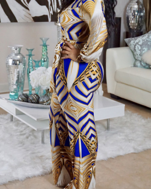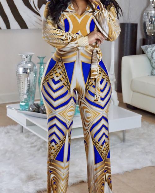 Euramerican V Neck Printed Khaki Cotton Blends One-piece Jumpsuits