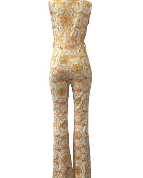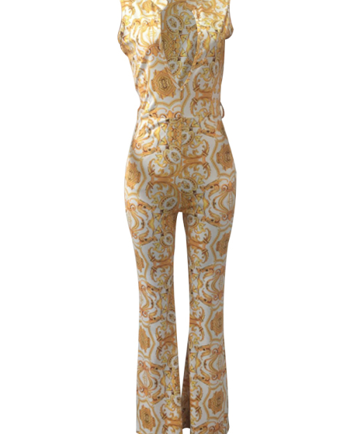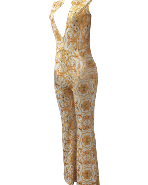 Euramerican V Neck Printed White Polyester One-piece Jumpsuits(Without Belt)