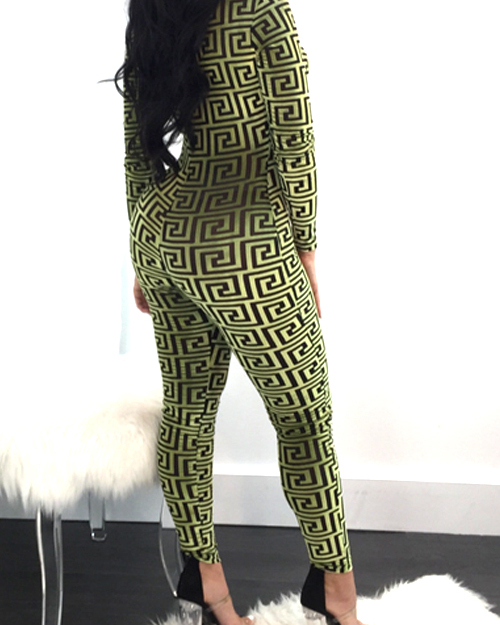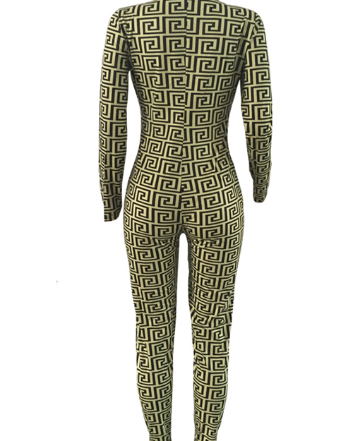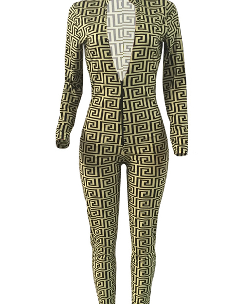 Euramerican V Neck Printed Yellow Cotton Blends One-piece Skinny Jumpsuits