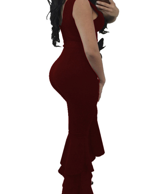Euramerican V Neck Zipper Design Wine Red Polyester One-piece Jumpsuits