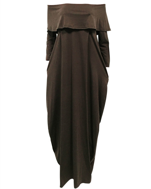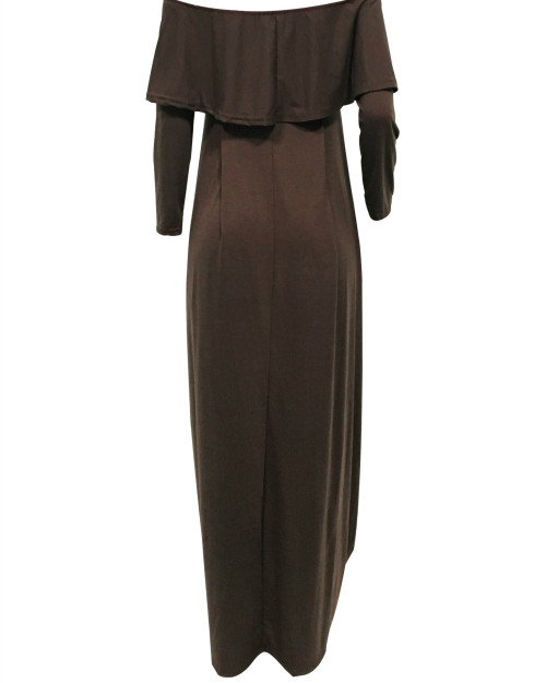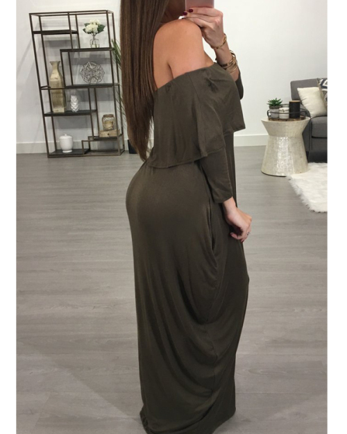 Fashion Dew Shoulder Falbala Design Grey-green Cotton Blend Ankle Length Dress