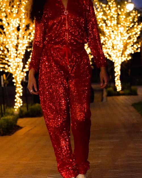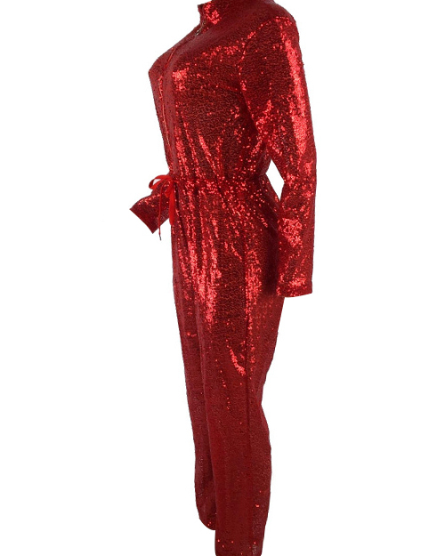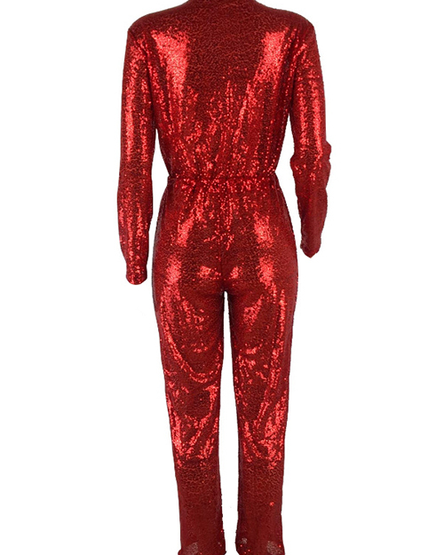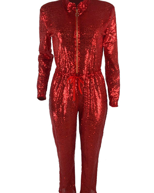 Fashion Mandarin Collar Sequins Decoration Red Polyester One-piece Jumpsuits