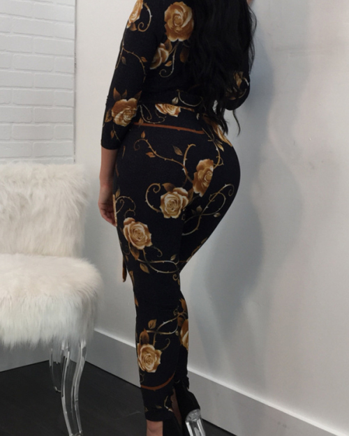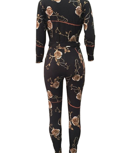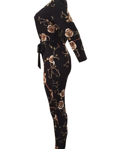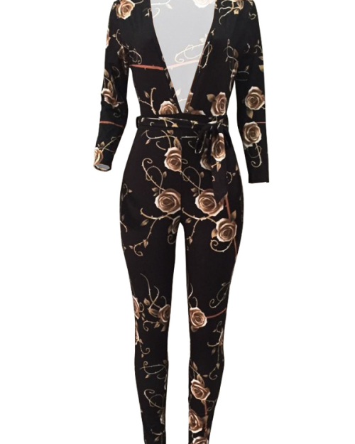 Fashion V Neck Floral Print Black Polyester One-piece Jumpsuits