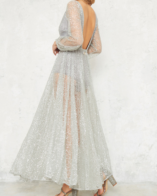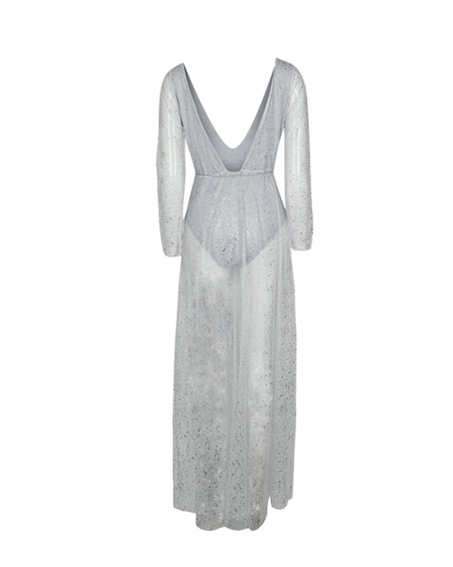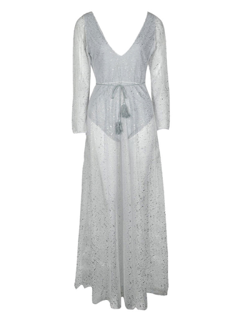 Fashion V Neck Long Sleeves See-Through Grey Polyester Ankle Length Dress