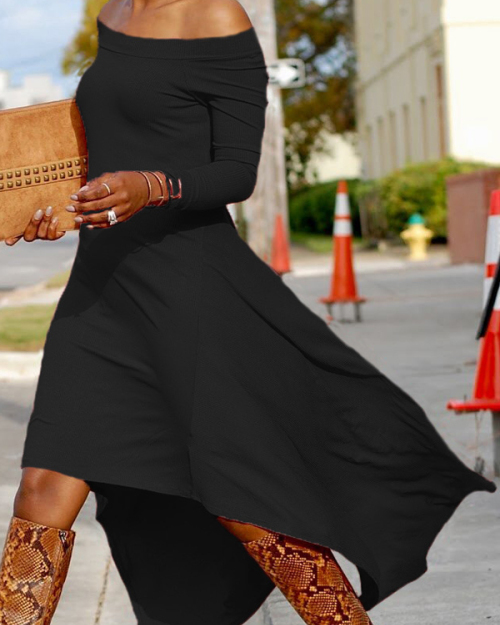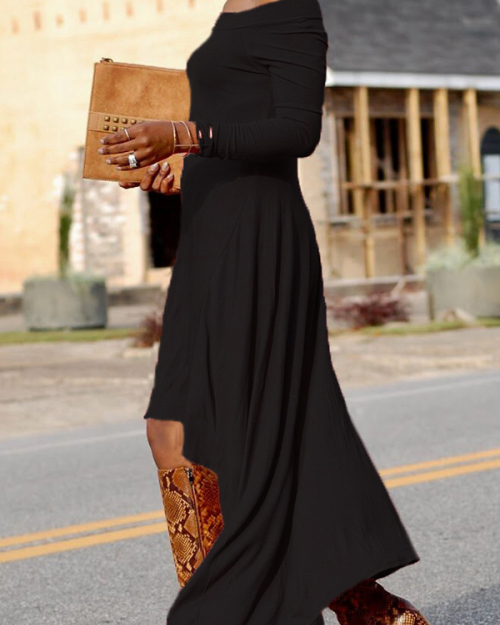 Fashionable Bateau Neck Dew Shoulder Black Cotton Ankle Length Dress
