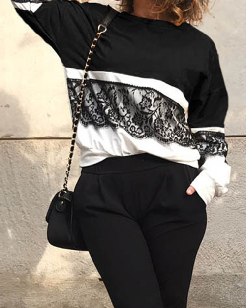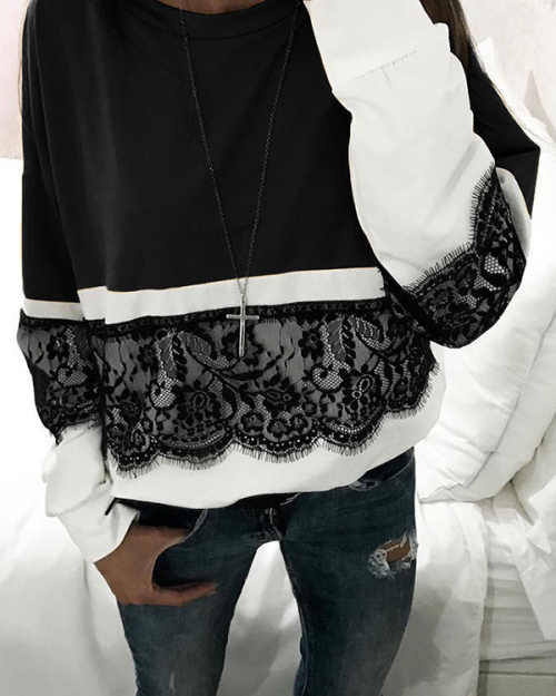 Fashionable Round Neck Lace Patchwork Black Polyester T-shirt
