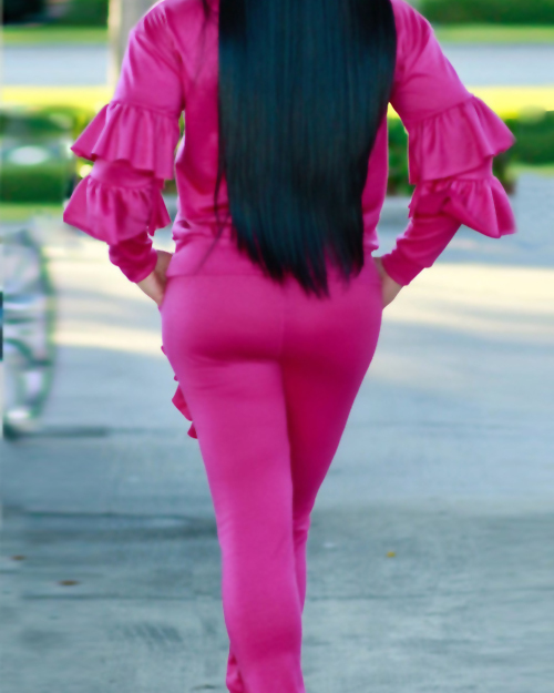 Fashionable Round Neck Ruched Rose Blending Two-piece Pants Set