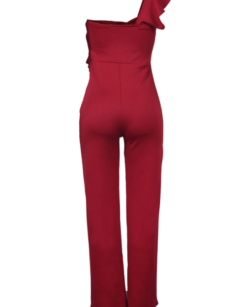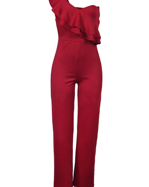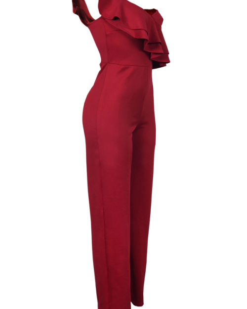 Fashionable Show A Shoulder Ruffles Design Red Polyester One-piece Jumpsuits