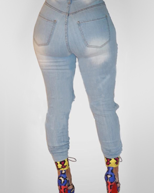 Stylish High Waist Broken Holes Light Blue Denim Pants