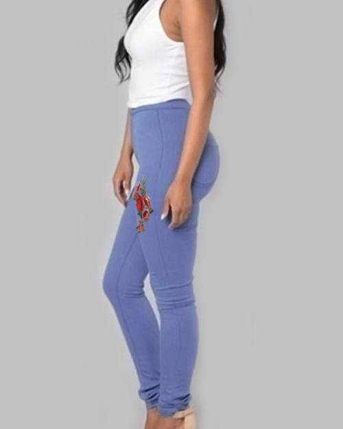 Trendy High Waist Embroidered Design Blue Denim Pants