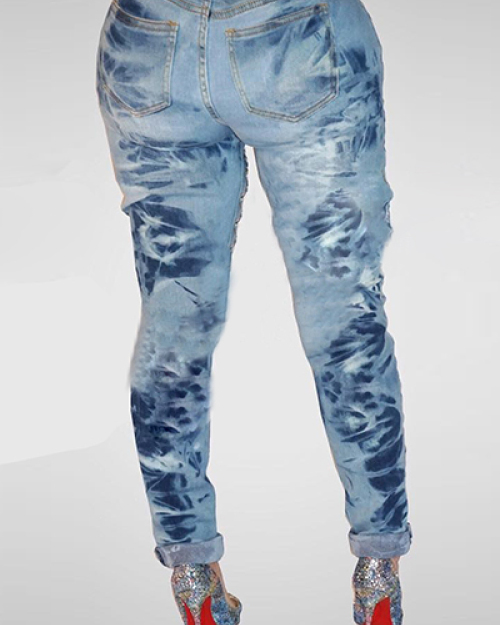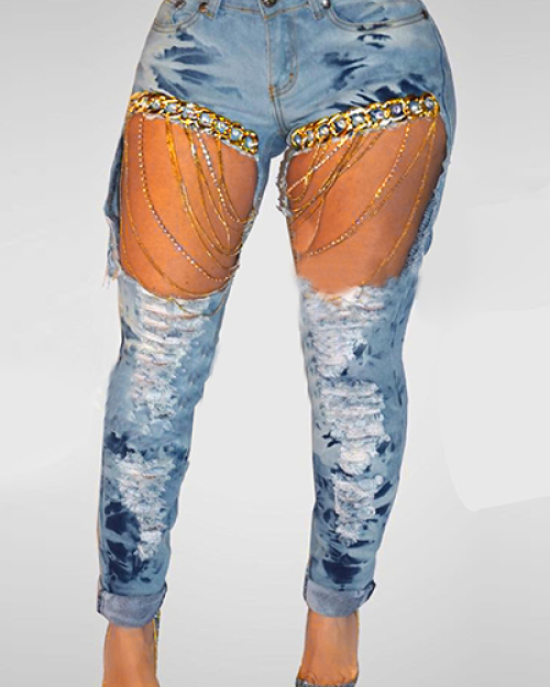 Trendy High Waist Tassel Hollow-out Light Blue Cotton Jeans Trendy High Waist Tassel Hollow-out Light Blue Cotton Jeans