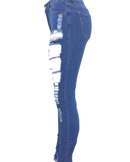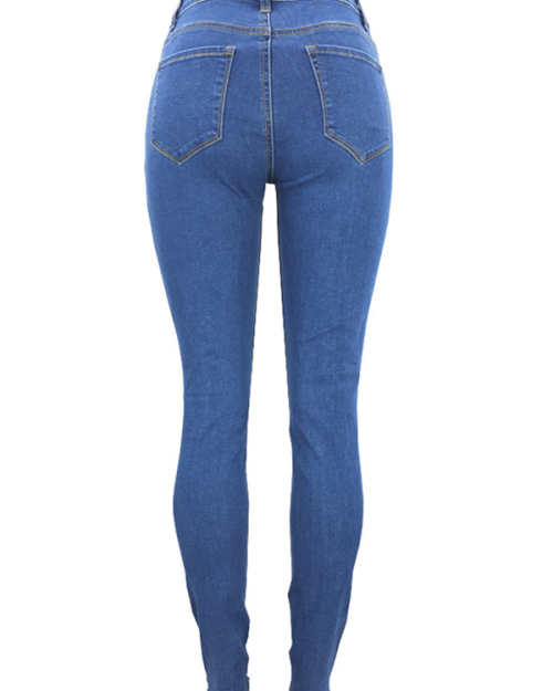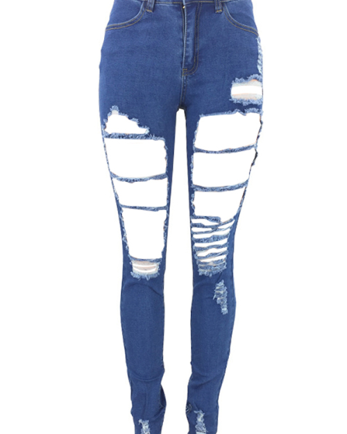 Trendy Mid Waist Broken Holes Blue Denim Pants