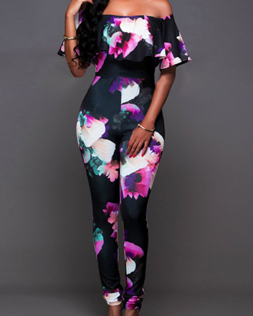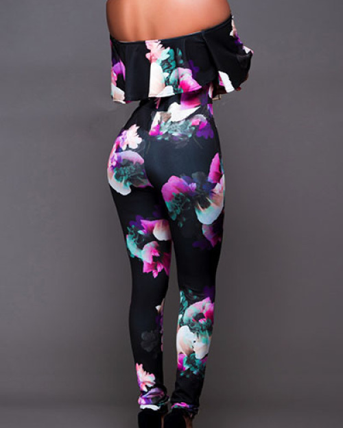 Charming Strapless Short Sleeves Floral Print Falbala Design Black Qmilch One-piece Jumpsuits