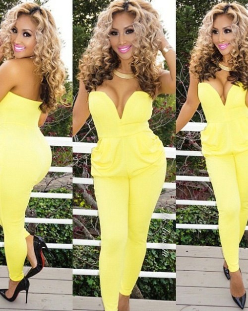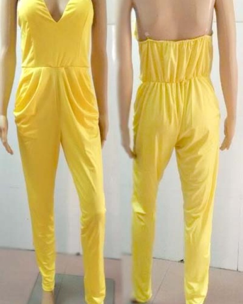 Cheap Sexy V-neck Strapless Yellow Polyester Jumpsuits