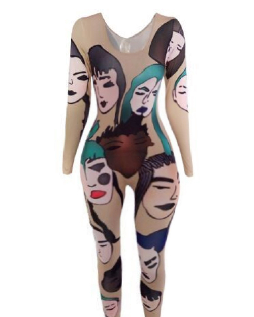 Euramerican Round Neck Long Sleeves Head Portrait Printed Qmilch One-piece Skinny Jumpsuits