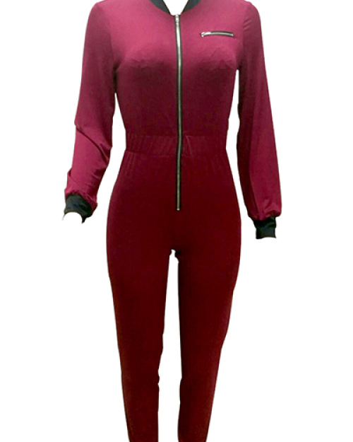 Euramerican Round Neck Long Sleeves Zipper Design Cotton One-piece Skinny Jumpsuits