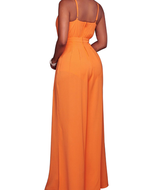 Euramerican V Neck Backless Orange Cotton Blends One-piece Jumpsuits(Without Belt)