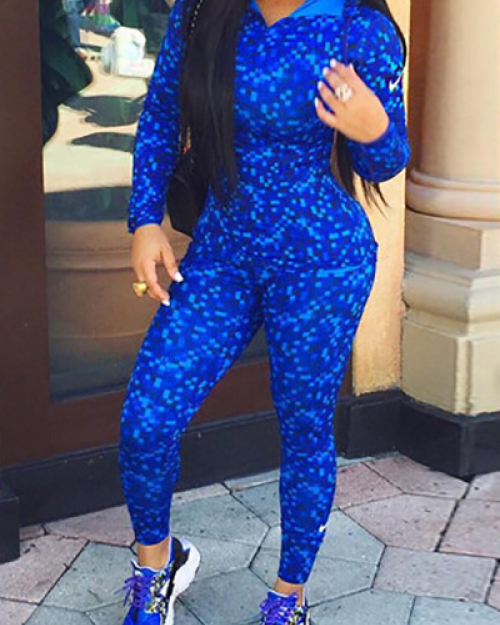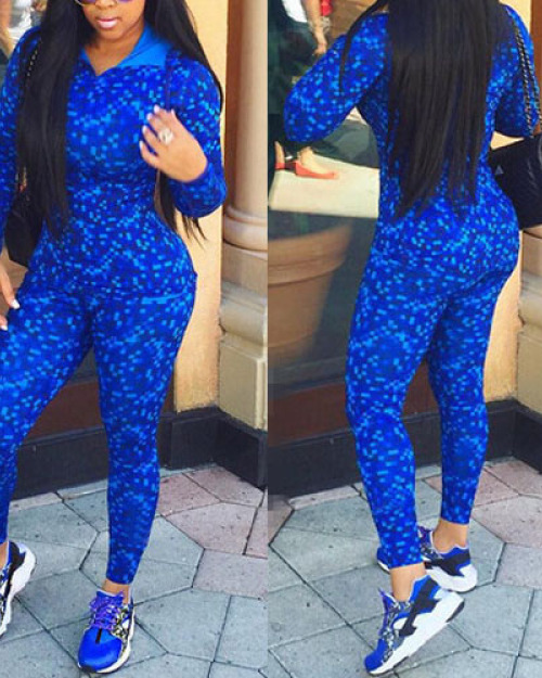 Fashion Casual Print Blue Polyester Skinny Jumpsuits Two-pieces Set